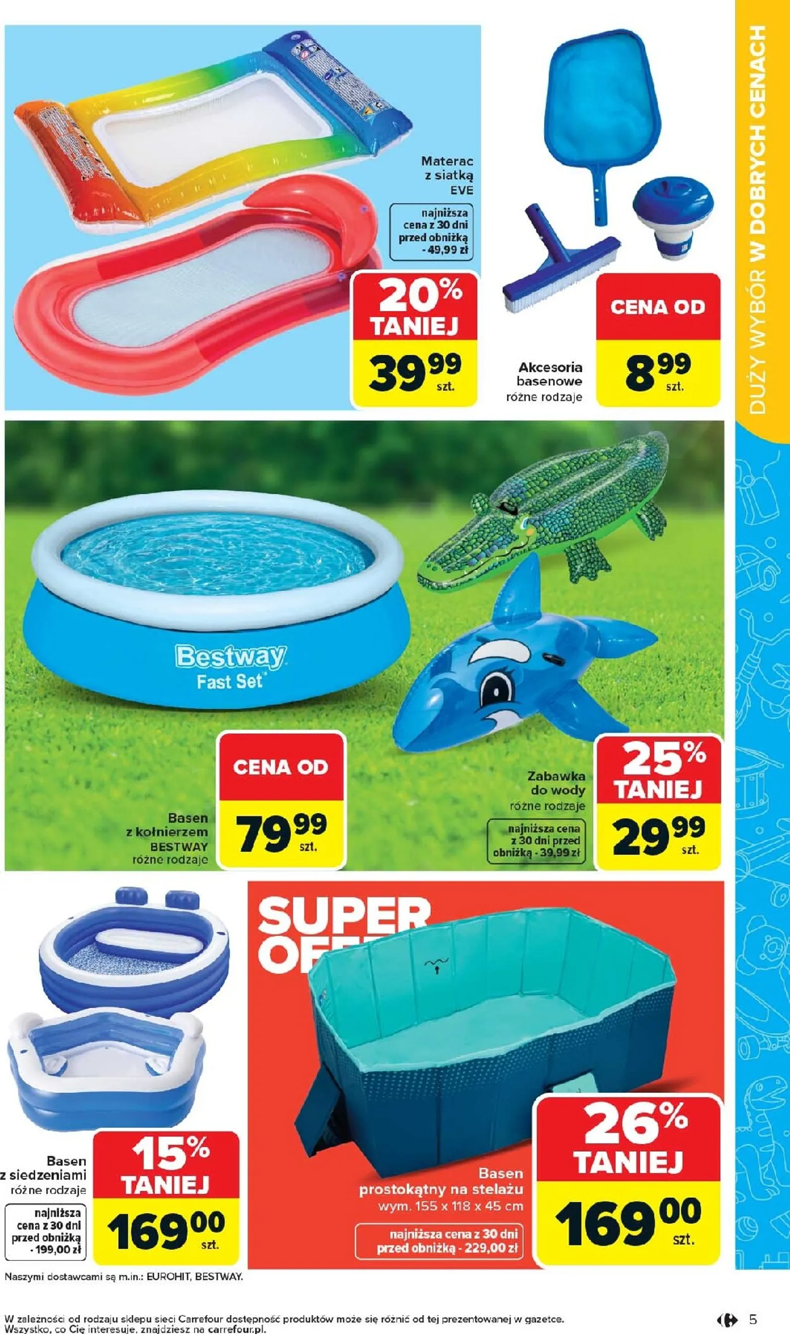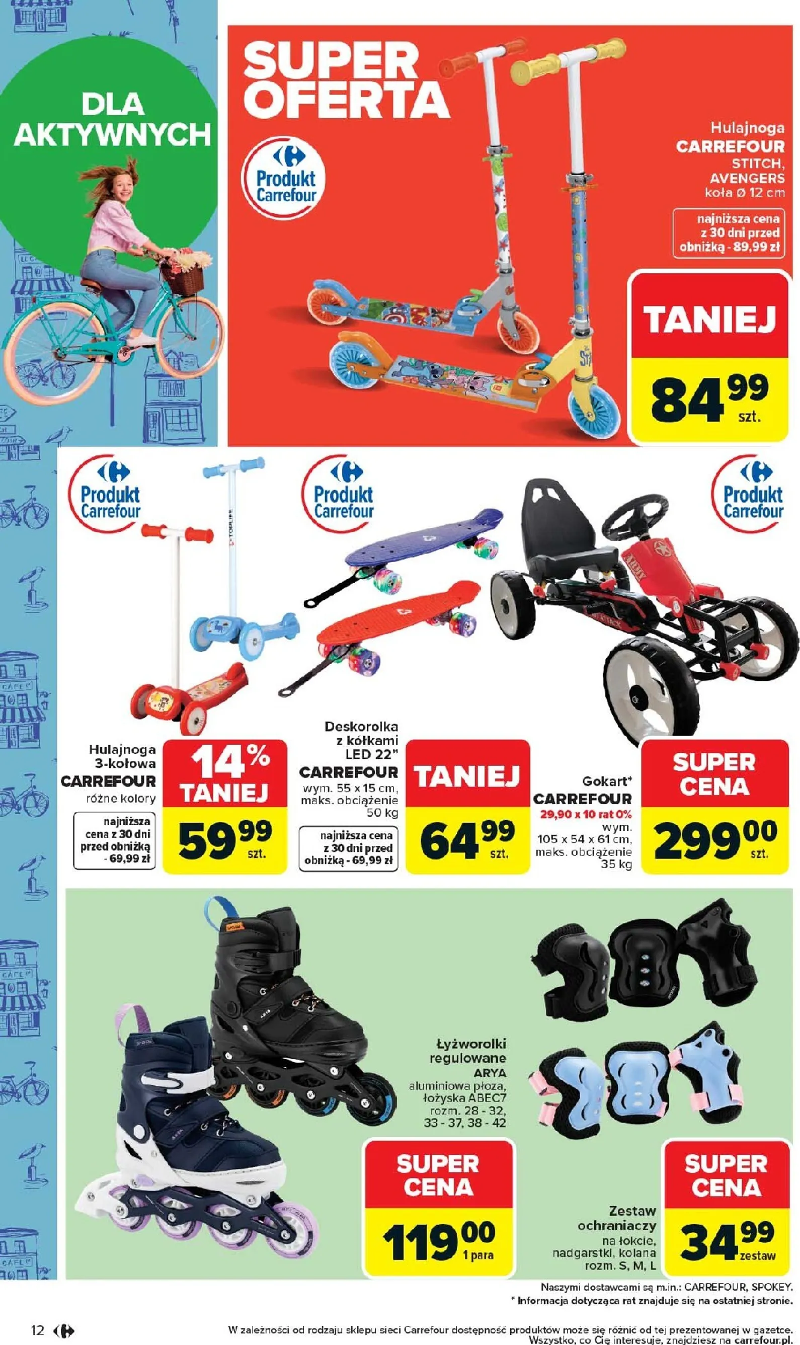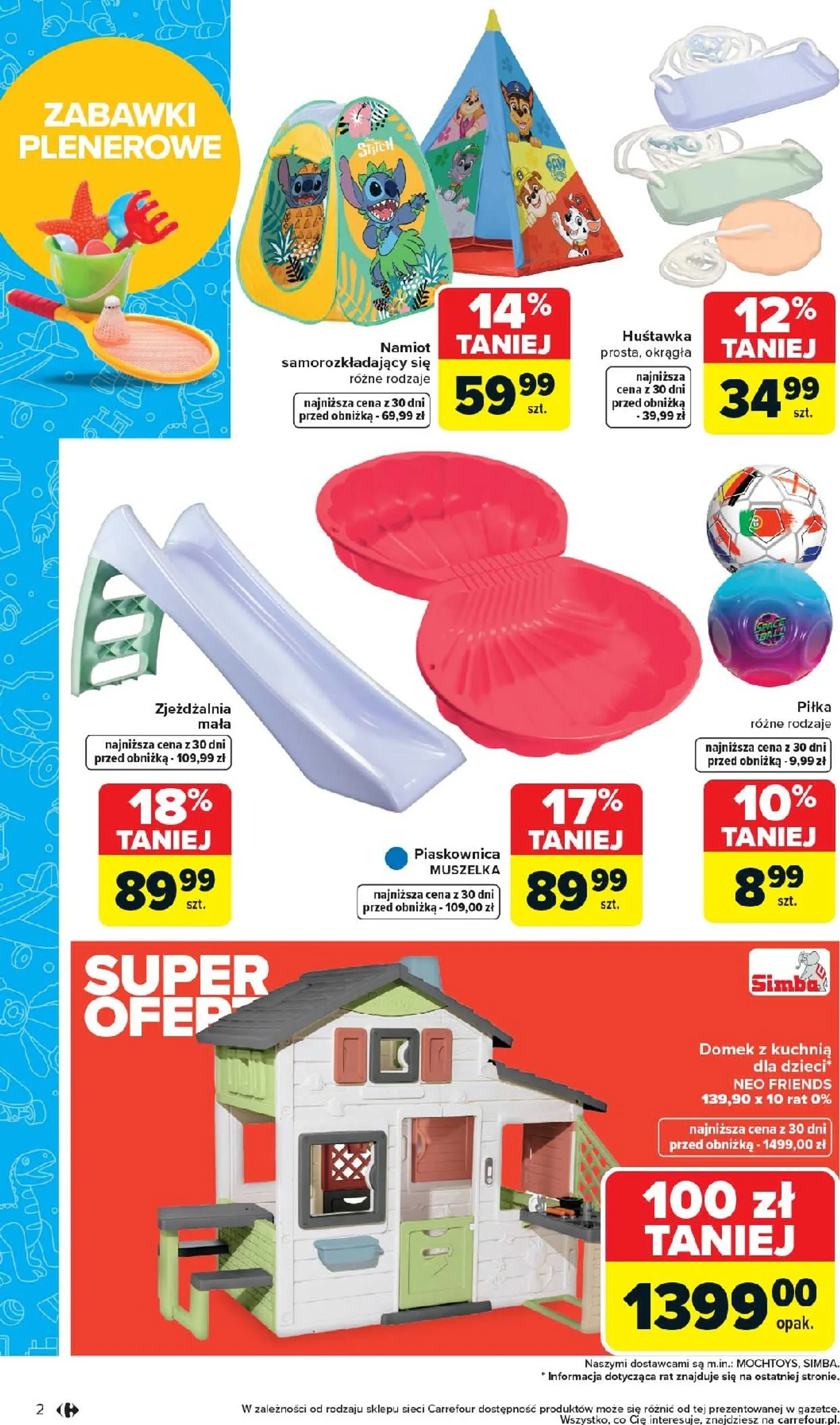 Już na pierwszej stronie gazetki Carrefour kusi domkiem ogrodowym dla dzieci, dostępnym za jedyne 449,00 zł (10% obniżki od 499,00 zł). Uzupełnieniem letnich zabaw będzie namiot samorozkładający się, oferowany za 59,99 zł (taniej o 14% z 69,99 zł), oraz huśtawka prostokątna w cenie 34,99 zł (zamiast 39,99 zł). Produkty te gwarantują uśmiech najmłodszych.