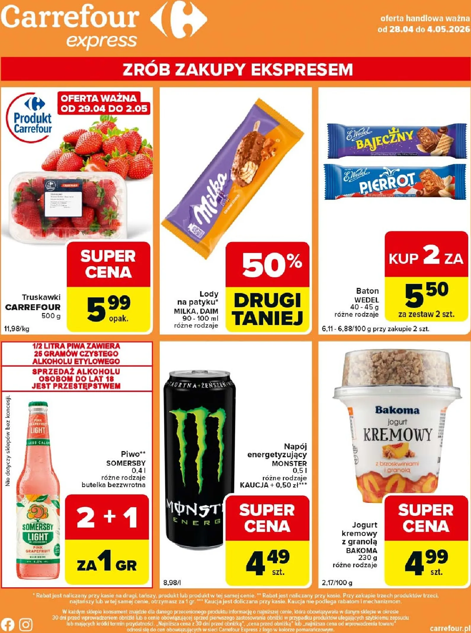Aktualna oferta Carrefour Express to także świeże Truskawki Carrefour 500g dostępne za 5,99 zł. Jeśli masz ochotę na coś słodkiego, lody na patyku Milka, Daim lub Oreo kupisz z rabatem 50% na drugi, tańszy produkt. Na szybką przekąskę idealnie sprawdzi się Baton Wedel 45g – kup dwa za 5,50 zł. Dla miłośników napojów przygotowano promocję na Piwo Somersby 0,4l, gdzie trzeci otrzymasz gratis! Zyskaj energię z Napojem energetyzującym Monster 0,5l za 4,49 zł (plus kaucja 0,50 zł) oraz spróbuj Jogurtu kremowego z granolą Bakoma 230g za 4,99 zł.